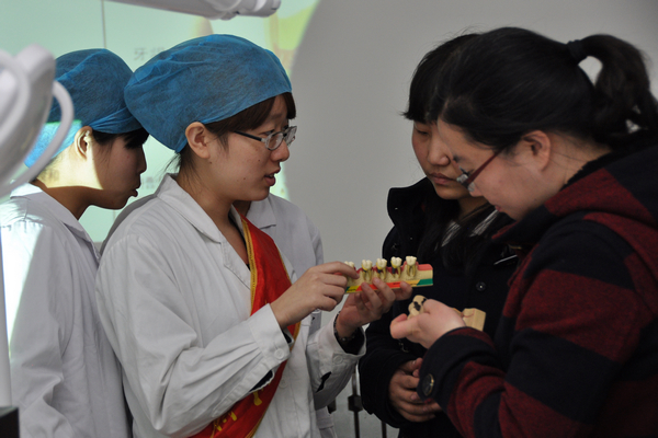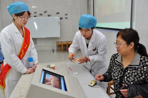 口腔医学院组织了本专业教师、附院口腔专家大夫、实习学生、在校学生等共计60余人参与了义诊服务活动,全天从早上8:30至下午5:00,为前来就诊的女老师提供了优质的服务,包括测体重、量血压、口腔检查、观看口腔预防保健录相及听取口腔保健专题讲座等项目,受到广大女职工的欢迎和好评。