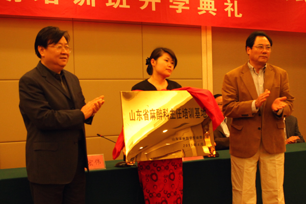 孙宏伟和类维富为“山东省麻醉科主任培训基地”揭牌。孙宏伟代表学校致欢迎辞。类维富就培训基地的设立、培训班举办的目的及意义作了讲话。揭牌仪式暨开学典礼结束后,张林和类维富分别作了学术报告。