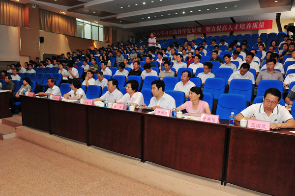 省委教育实践活动第十一督导组副组长、省纪委监察综合室副主任张洪东,督导组成员李涛、康宏岩、史培亮、王勇,校领导马安宁、秦玉明、张潍华、孙宏伟、朱军、井西学、管英俊、葛国文,学校部门、院(系)领导班子成员,近5年退出领导班子的老同志,教育教学质量督导评估专家,正高级职称专业技术人员,部分教学科研人员代表,教师代表和学生代表参加大会。
