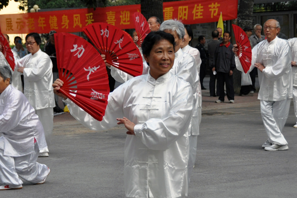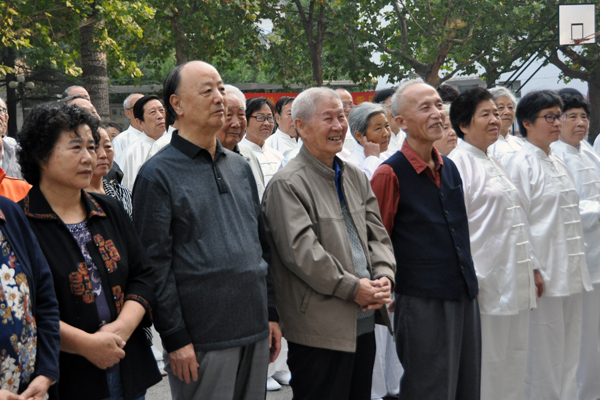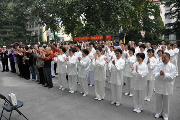 太极拳、太极剑、太极扇等太极系列项目表演拉开了老年运动会的序幕,40余名老同志身着太极服,精神抖擞、身姿矫健,队伍中包括80岁以上高龄的老教授有刘思奇、粱坤义、范瑞芳、沈禄康、张玉杰等,他们潇洒自如的动作博得观众们的阵阵掌声