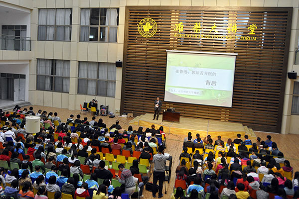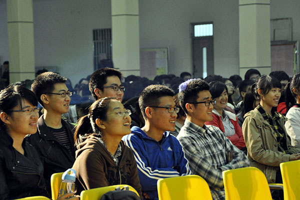 魏建结合鲁迅和郭沫若的成长经历引出了“他们失败了?还是成功了?”的话题。他将讲与演巧妙结合,模仿人物对话惟妙惟肖,用抑扬顿挫的语调,丰富而深刻的内容赢得现场阵阵掌声。通过对多个历史人物经历的对比分析,提出看人应“先破成败之见”的主张。在先后论述了“逆境出人才”等传统理念的片面性后提出“与其追求成功,不如追求完善”的建议,并对成功和完善的概念做出了阐述,带领大家思考成败真谛。在提问环节中,魏建对学生所提问题做出了精彩解答。