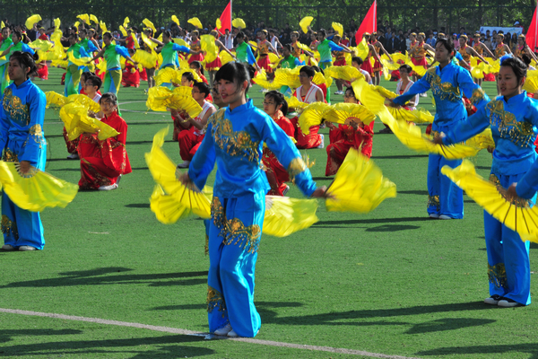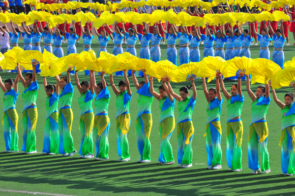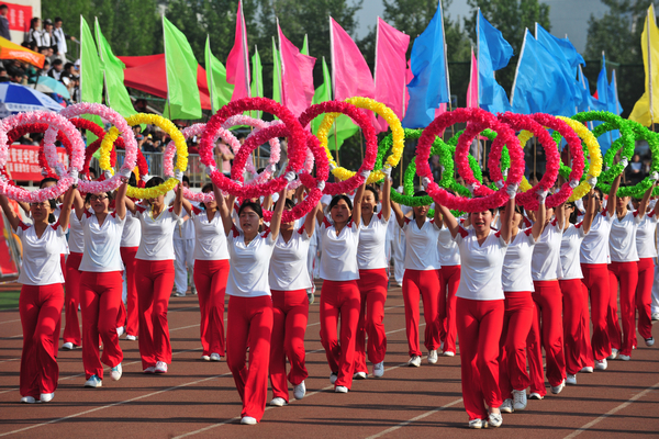 校党委书记石增立宣布第四十二届运动会开幕。精彩纷呈的团体操表演开始,来自各个部门、院(系)的130多位老师带来《火了 火了 火》的排舞展演,由10个院系的672名同学表演扇子舞《欢聚一堂》,赢得了现场观众的热烈欢呼。
