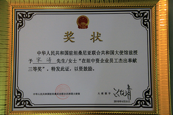 4月25日,中国驻坦桑尼亚大使馆隆重举行在坦中资企业优秀员工表彰大会,对长期工作在坦桑中资企业并做出突出贡献的坦桑和中国籍员工进行了表彰。必赢官网教师宋涛荣获杰出奉献三等奖。