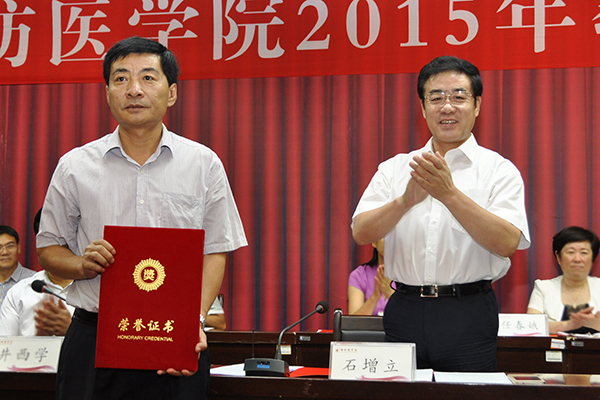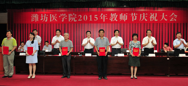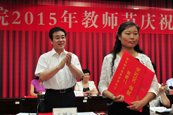 石增立代表学校为山东省科学技术进步奖二等奖获得者张维芬教授颁发证书、并颁发奖金30万元;为山东省高等学校教学名师张正厚教授颁发证书。校领导分别为校优秀教师代表、先进工作者代表、实践教学先进集体和先进个人代表、在教育教学岗位工作满30年的教职工代表颁奖。