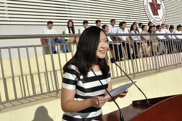 教师代表卢国华教授,新生代表、2015级临床医学专业张子翰, 2015级博士研究生沈郁淇,在校生代表、2014级硕士研究生张寒分别发言。