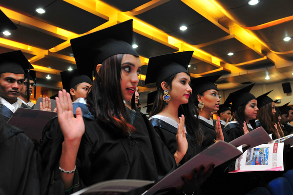 马福顺博士作为教师代表发言,祝贺毕业同学圆满完成学业,并祝福他们归国后工作顺利。尼泊尔籍留学生马诺代表毕业生发言,表达了对母校和老师们的感激留恋之情。最后,全体毕业生一起重温了“医学生誓言”。