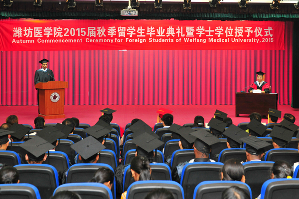 副校长井西学代表学校向圆满完成学业的留学生表示祝贺,希望同学们铭记“乐道 济世”的校训,继续发扬“自强不息、锐意进取”的潍医精神;继续做中外文化的使者,宣传中国、宣传母校;继续与学校保持联系,一如既往地关注、支持学校的发展与进步。