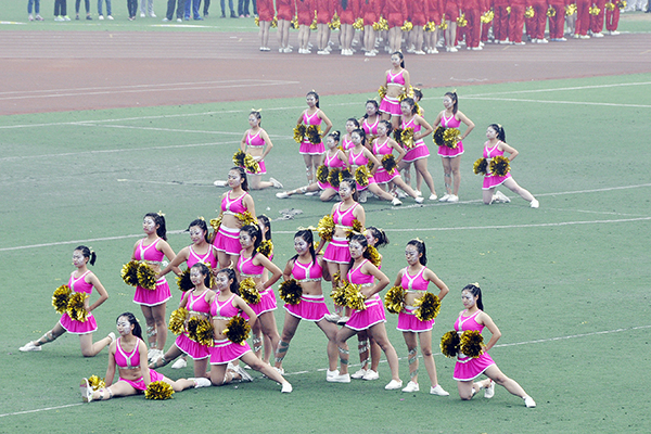 开幕式结束后,健美操团体比赛精彩上演,现场欢呼声喝彩声不绝于耳,展现了青年学生健康快乐、蓬勃向上的精神风貌。