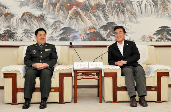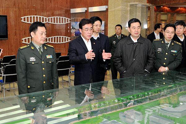 石增立代表学校对万伟锋一行的到来表示热烈欢迎,并简要介绍了学校的办学历史以及近几年学校人才培养、教学科研、社会服务、文化传承等方面的基本情况。双方就发挥学校教学科研、医疗卫生服务等方面优势,推进军民深度融合等相关内容进行了交流,希望能够进一步加强合作,寻求新的切入点,推进军民融合式发展工作取得新的成效。