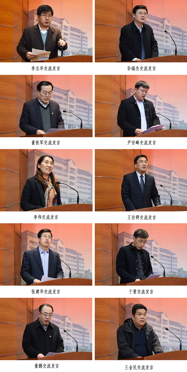 会上附属医院党委书记李志华,人事处处长孙瑞杰,临床医学院党委书记董铁军,总务基建党总支副书记、总务处处长尹世峰,护理学院党总支副书记、院长李伟,党委宣传部(统战部)部长王世群,公共卫生与管理学院党委副书记、院长张建华,资产管理处处长于雷,医学影像学系党总支副书记、主任董鹏,网络信息中心主任王金民分别代表院(系)、部门结合工作实际和学习体会做了大会交流发言。