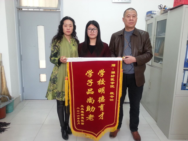为表达谢意,老人的家人亲自赶到学校,把印有“学校明德育才,学子品尚助老”的锦旗送到段会汝同学手中。面对鲜红的锦旗,段会汝同学谦虚地说:“当时想的就是赶紧为老人找到家人,让老人和家人好好的过个小年,我做的只是微乎其微的一件小事,是应该做的”。