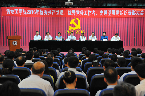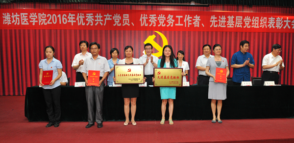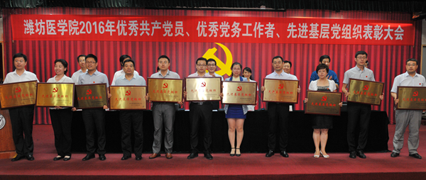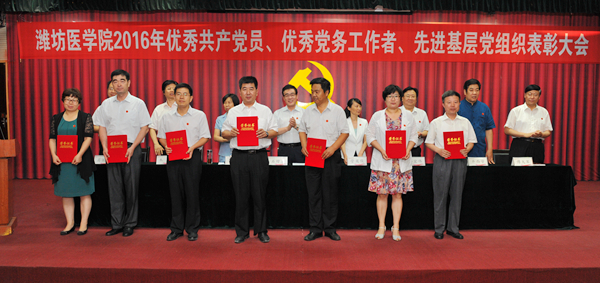 校党委副书记张潍华宣读了受中共山东省委高校工委、中共潍坊市委表彰的优秀共产党员、优秀党务工作者、先进基层党组织名单和《中共潍坊医学院委员会关于表彰优秀共产党员、优秀党务工作者、先进基层党组织的决定》。校领导为受到中共山东省委高校工委表彰的优秀共产党员王金才、优秀党务工作者于斌、先进基层党组织麻醉学系党总支,受到中共潍坊市委表彰的优秀共产党员张春燕、先进基层党组织临床医学院党委和受到学校表彰的95名优秀共产党员、19名优秀党务工作者、11个先进基层党组织颁奖。