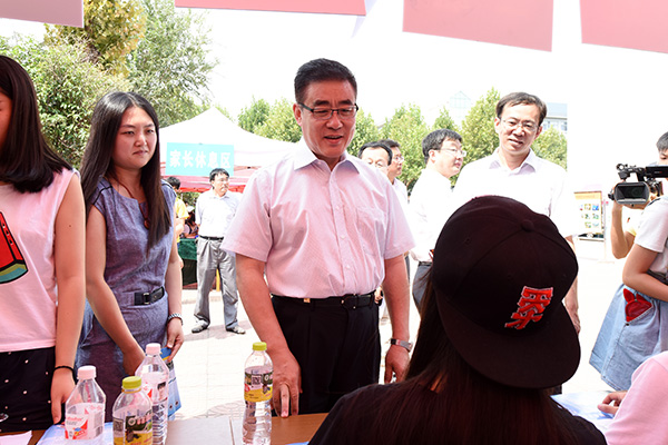 校党委书记石增立在迎新现场与学生亲切交谈 |