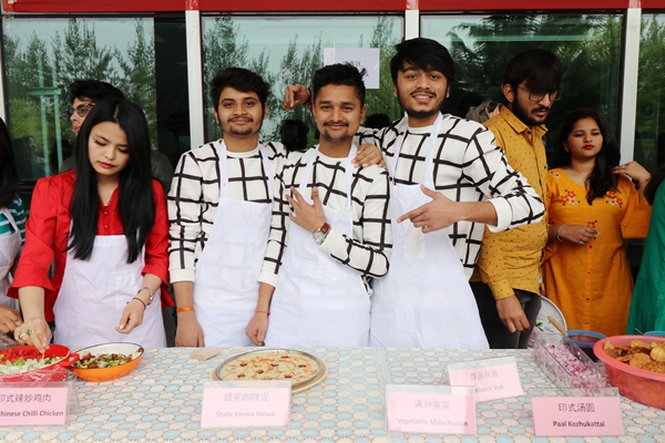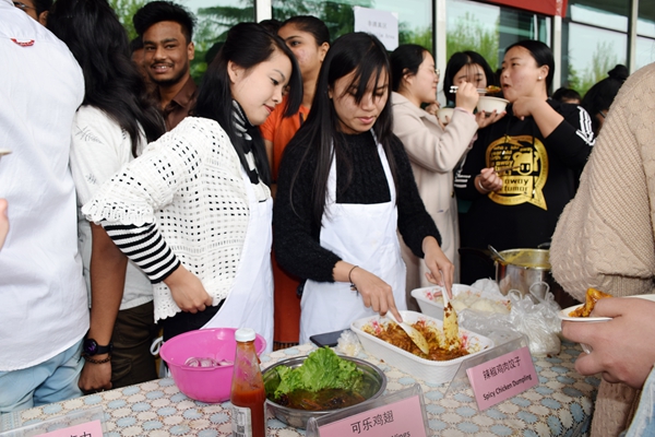 中外美食展展示了各国饮食文化和民族特色。中外学生亲自动手制作的特色菜品共计30道。“印式辣炒鸡肉”色香俱佳,“玫瑰奶球”软糯可口,“酸奶炸糕”松软清爽,“茄汁藕饼”鲜嫩多汁,“莫卧儿鸡肉烤饭”“腰果咖喱泥”“印式甜甜圈”等式样多味道美。中国学生制作的“乡子味道”“茄子肉灯笼”“临渊羡鱼”等也都受到师生喜爱。