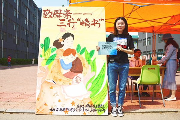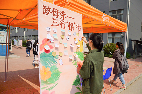 活动现场,同学们纷纷在便签纸上写下对母亲的“情”书,并手持祝福语在宣传板前合影留念。活动之温情吸引了众多同学驻足,现场气氛浪漫温馨。