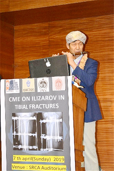 第二天学术报告会现场,该医院院长及当地骨科专家举行了隆重的欢迎仪式,请秦泗河教授点燃“智慧灯”,象征着将知识和大爱撒满人间。秦泗河教授用手术视频、患者治疗前后形态与功能对比,展示了秦泗河矫形团队践行的肢体自然重建理念,以及“一路、两线、三平衡”下肢重建外科原则。通过独特的手术风格,向印度骨科学界展现了一个具有中国特色的下肢矫形外科技术体系。当地骨科学会主席亲自为远道而来的中国骨科专家“加冕”,很多医生则纷纷提出了到北京跟秦泗河教授进修的申请。课程中间秦泗河教授特意为会场献上一首竹笛独奏《天下一家》。