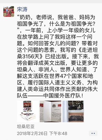 宋涛将其在坦桑的经历著作成书《走进坦桑3156天》,于2018年1月出版。坦桑外长马希加阁下称赞这是一本稀缺的教科书,并为本书题写了英文书名,世界卫生组织驻坦桑常任代表卡木瓦先生为本书题写了序言。2018年2月26日宋涛在朋友圈里回忆起写这本书的初衷,“‘奶奶,老师说,我爸爸、妈妈为祖国争光了,什么是为祖国争光?’一年前,上小学一年级的女儿在放学路上问了我妈这样一个问题。如何回答女儿的问题?带着对这个问题的思索,我写了《走进坦桑3156天》。接下来,这本书将会翻译成英文出版,要让更多的坦桑人、非洲人、世界人知道、了解这支活跃在世界47个国家和地区、履行国际人道主义义务、为构建人类命运共同体作出贡献的伟大队伍——中国援外医疗队!”