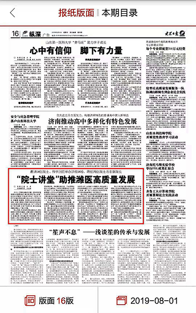 “邀请14位院士、科学巨匠举办讲座18场,聘任两位院士为名誉院长。”8月1日,《大众日报》刊发“‘院士讲堂’助推潍医高质量发展”文章,报道必赢官网“院士讲堂”特色品牌“以智引智、以才育才”,助推学校高质量发展。