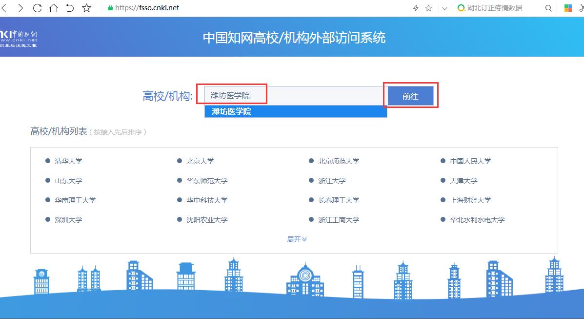 1、浏览器输入网址:https://fsso.cnki.net,在页面的“高校/机构”检索框中输入“潍坊医学院”(支持模糊检索),点击“前往”。