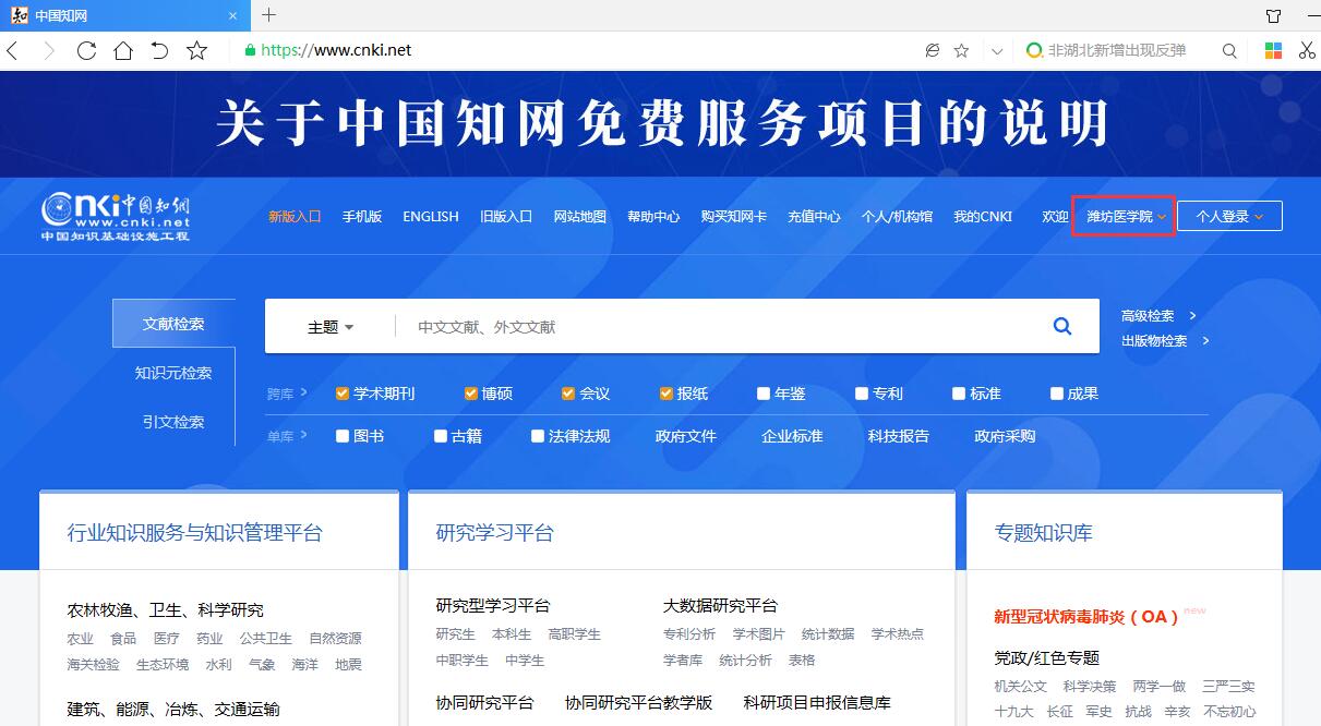 3、登录后,页面跳转到中国知网中心网站www.cnki.net,页面右上角会显示用户名为“潍坊医学院”,表示认证完成,即可访问使用知网资源。