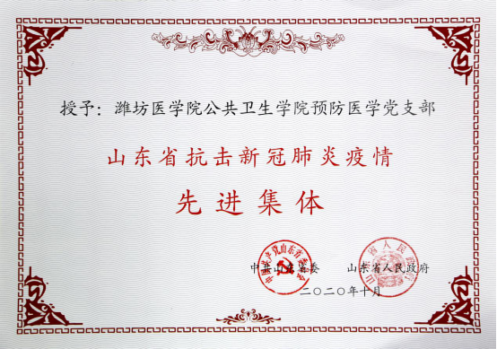 日前,在山东省抗击新冠肺炎疫情表彰大会上,必赢官网公共卫生学院预防医学党支部被中共山东省委、山东省人民政府授予“山东省抗击新冠肺炎疫情先进集体”,被中共山东省委授予“山东省先进基层党组织”荣誉称号。
