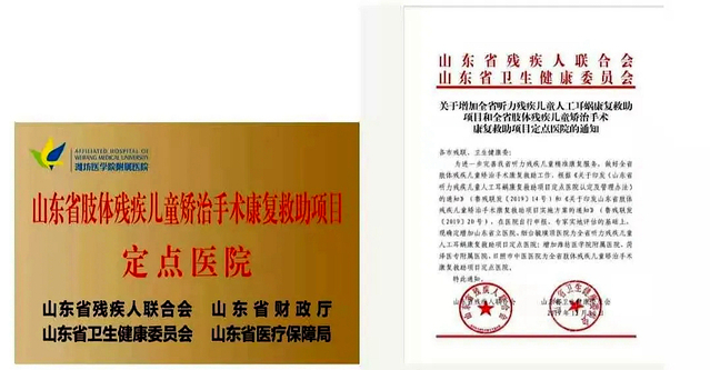 潍坊医学院附属医院是省残联、省卫健委认证获评的山东省肢体残疾儿童矫治手术康复救助项目定点医疗机构,可为具有山东省户籍且年龄18周岁以下适合矫治手术的儿童实行全额免费救治。《山东省肢体残疾儿童矫治手术康复救助项目实施方案》走在了全国的前列,不但放宽了救助年龄,而且扩大了救助范围。