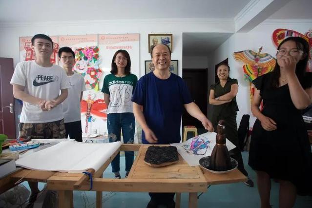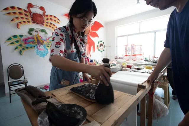 杨家埠文化一脉传承至今,国家级非物质文化遗产代表性传承人杨红卫老师做出了巨大贡献,她是潍坊“风筝王”杨同科第三代传承人,从艺数十年,获奖无数。在杨老师的帮助下,志愿者们尝试亲手制作木版年画与风筝。大家先用浸润墨汁的刷子细细地刷遍木板的每个角落,随后慢慢地抻紧宣纸,平铺在木板上,最后拿起烫子来回一遍遍地压实宣纸。轻轻揭开宣纸,一个活灵活现的送财童子形象跃然纸上。