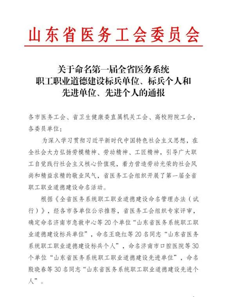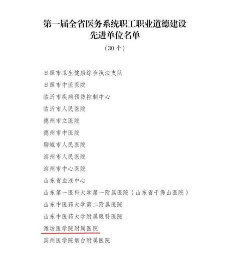 日前,山东省医务工会委员会发来《关于命名第一届全省医务系统职工职业道德建设标兵单位、标兵个人和先进单位、先进个人的通报》,潍医附院榜上有名,荣获“第一届全省医务系统职工职业道德建设先进单位”称号。