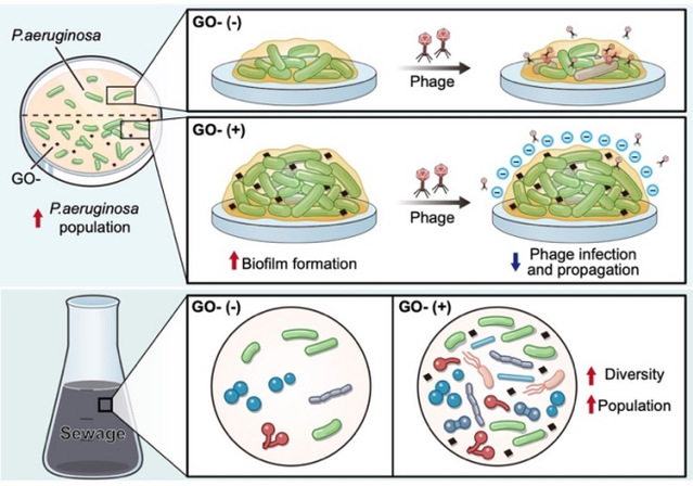 氧化石墨烯(GO)作为一种多功能纳米材料,已广泛应用于生物医药、印染、储能/转换、传感器等领域。研究团队探讨了GO对水环境中微生物互作平衡的负面影响,明确了GO影响对噬菌体及其宿主细菌互作的机制。该项研究为GO如何影响水生环境中的细菌-噬菌体相互作用机制提供了第一证据,并首次从噬菌体角度对GO风险评估提供了宝贵的见解。本项目获国家自然科学基金面上项目(No. 81572028)等项目资助。