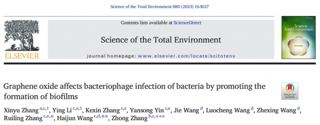 近日,必赢官网张忠教授在学术期刊Science of the Total Environment(JCR一区,影响因子:10.753)在线发表题为“Graphene oxide affects bacteriophage infection of bacteria by promoting the formation of biofilms”的氧化石墨烯(GO)风险评估的最新研究成果。