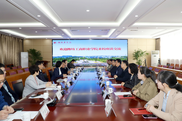 4月10日上午,潍坊工商职业学院校长张绍秋、党委书记葛国文等一行9人来校交流。副院长卢国华,党委委员、宣传部长田玉胜会见客人并座谈。
