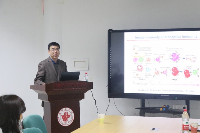 高成江教授以《天然免疫活化调控机制》为题做了精彩学术报告。他围绕天然免疫抗病毒信号转导的关键节点蛋白——线粒体蛋白MAVS,详细介绍了MAVS蛋白泛素化修饰和精氨酸甲基化修饰参与MAVS的聚集活化,调控抗病毒信号通路的分子机制。报告结束后,高教授与师生进行了专题交流。