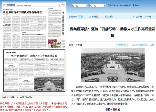文章报道,近年来,潍坊医学院坚持党管人才,按照学校“1128”发展思路,锚定高水平医科大学奋斗目标,统筹推进“体制、平台、评价、服务”四能联动,把党的政治优势、组织优势转化为人才发展优势,加大人才引育力度,充分激发人才活力,推动学校高质量发展。