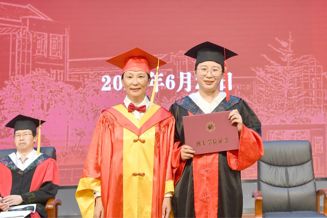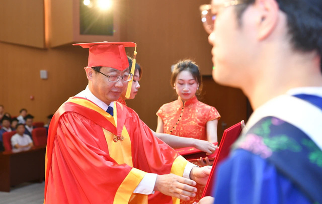 学校学位评定委员会主席、院长管英俊为获得博士学位的毕业生授予学位,颁发学位证书。