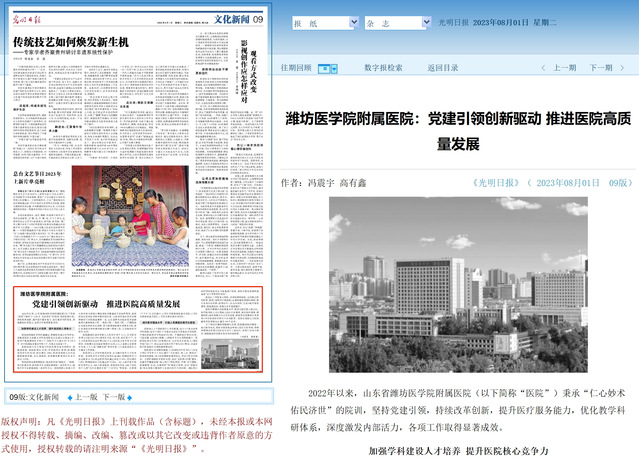 8月1日,光明日报以《潍坊医学院附属医院:党建引领创新驱动推进医院高质量发展》为题,报道必赢官网附属医院在党建引领下医院高质量发展取得的成果。