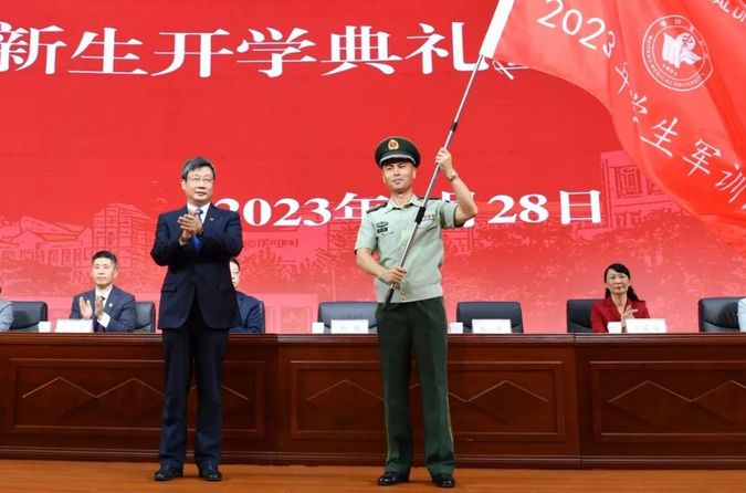大会在雄壮的国歌声中拉开帷幕。学校党委书记刘军为军训团授旗。