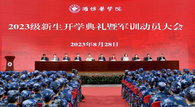 校园欢歌,喜迎新生。8月28日上午,潍坊医学院2023级新生开学典礼暨军训动员大会在浮烟山校区文体活动中心隆重举行。综合馆里气氛喜庆热烈,会场内悬挂的“金秋涤暑 踌躇满志践青衿之志,丹桂飘香 笃行不怠强青年担当 ”“自强不息 锐意进取 在矢志奋斗中谱写时代之歌 ,国家召唤 使命必达 在复兴伟业中造就青春荣光”等标语分列两侧、振奋人心。