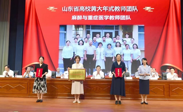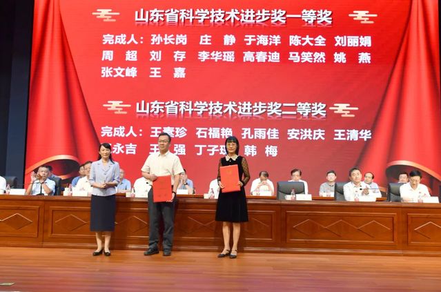 院长管英俊为山东省科技进步奖成果负责人和第三批山东省高校黄大年式教师团队成员代表颁奖。