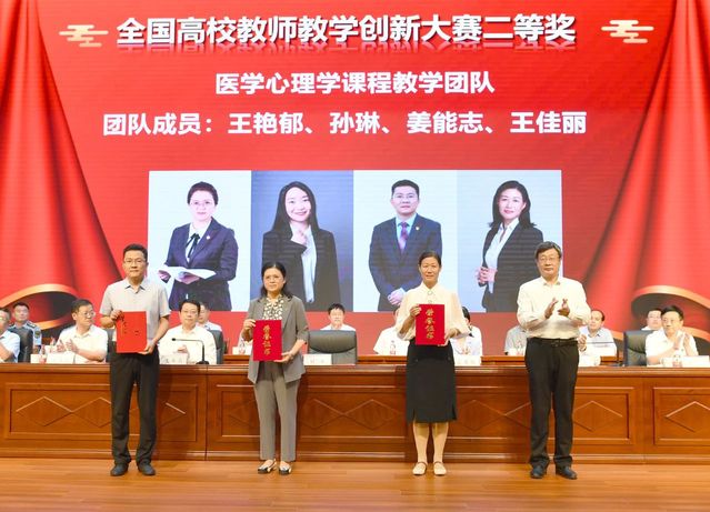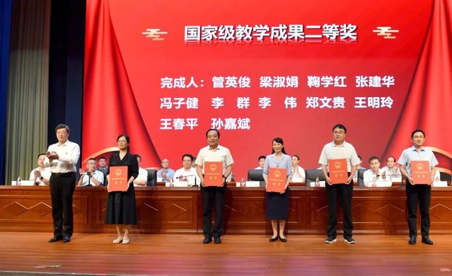 庆祝大会在雄壮的国歌声中拉开帷幕。校党委书记刘军为2022年国家级教学成果奖二等奖项目组成员和第三届全国高校教师教学创新大赛二等奖团队成员颁奖。