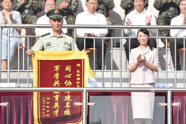 院长管英俊为武警潍坊支队赠送锦旗,感谢所有教官的辛勤付出。