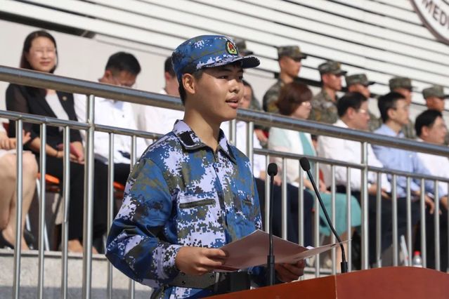 军训学生代表管理学院2023级胡智鹏同学发言。