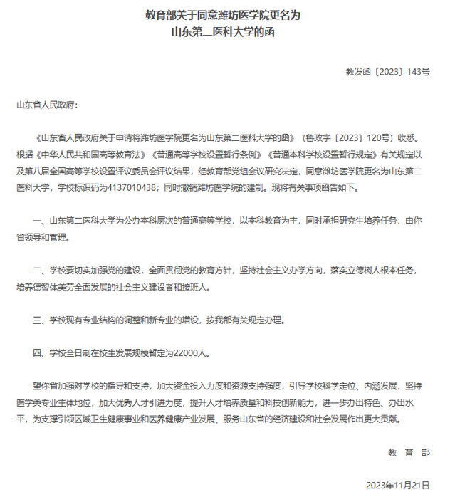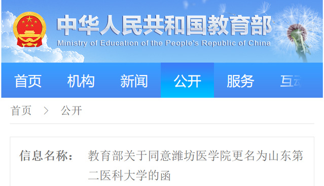 近日,教育部向山东省人民政府发送《教育部关于同意潍坊医学院更名为必赢242net官网的函》,经教育部党组会议研究决定,同意潍坊医学院更名为必赢242net官网。