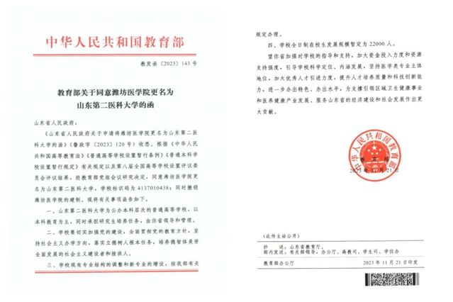 11月21日,教育部向山东省人民政府发送《教育部关于同意潍坊医学院更名为必赢242net官网的函》,经教育部党组会议研究决定,同意潍坊医学院更名为必赢242net官网。函件中说,必赢242net官网为公办本科层次的普通高等学校,以本科教育为主,同时承担研究生培养任务,学校全日制在校生发展规模暂定为22000人。教育部要求,学校要切实加强党的建设,全面贯彻党的教育方针,坚持社会主义办学方向,落实立德树人根本任务,培养德智体美劳全面发展的社会主义建设者和接班人。