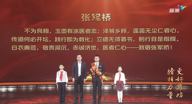 本次颁奖典礼以“榜样力量 更好潍坊”为主题,评选出近三年来各行各业敬业奉献、教书育人、扎根基层、科技报国的“感动人物”代表。颁奖词中这样写道:“不为良相,玉壶有冰医者志;泽被乡梓,莲蕊无尘仁者心。传道何必开坛,践行即为教化;立德无须著书,躬行自是楷模。白衣典范,敬畏深沉,赤诚济世,医者仁心。”张军桥将初心和使命写在抗击疫情第一线、救死扶伤最前沿,用实际行动展现了榜样力量。