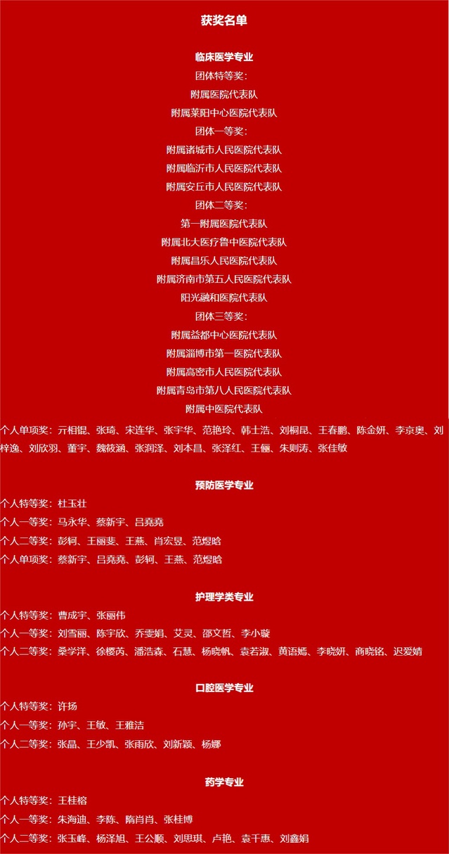 大赛共评出临床医学专业团体赛特等奖2项、一等奖3项、二等奖5项、三等奖5项,预防医学、护理学类、口腔医学及药学专业个人赛共评出特等奖5名,一等奖16名,二等奖27名,单项奖和优秀奖96名。