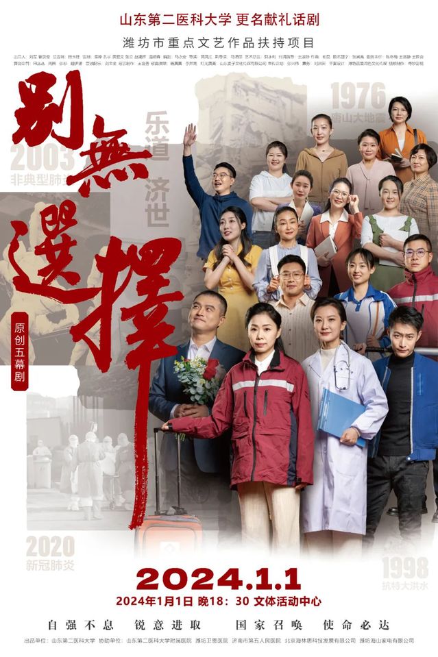 原创五幕话剧《别无选择》,以医学世家三代人的故事为主线,通过医学生黄南星从抗拒学医到在抗疫前线理解母亲、领悟医者神圣的成长历程,串联起唐山地震、汶川救灾、援藏医疗及新冠疫情等重大历史事件中医务工作者的奉献,表现了现代人关于事业、家庭、责任、成长、家国、亲情、爱情等等多个方面所面临的内心呼唤与人生抉择。