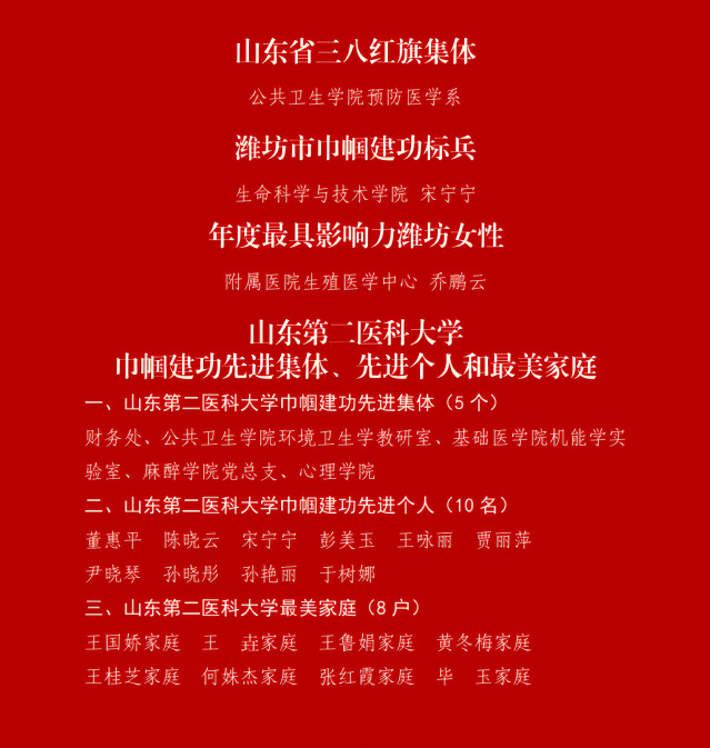 会上,为2024年度山东省三八红旗集体公共卫生学院预防医学系、学校巾帼建功先进集体、先进个人和最美家庭获得者颁奖。参会代表讲述了个人的“小家”和学校的“大家”以及共同的“国家”的故事,表示将继续发挥自身优势,营造和谐团结的工作环境,为高水平医科大学建设贡献力量。