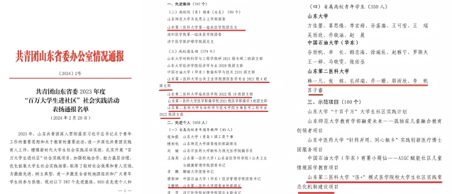 自团省委“百万大学生进社区”社会实践活动启动以来,校团委以“构建志愿服务品牌,推进实践育人成效”为总体思路,立足专业优势打造了医学院校社区实践的“医+”模式,进一步深化共青团实践育人工作。加强校地合作,助力基层治理,优化拓展大学生社会实践场景,增强新时代大学生社会实践活动实效,获批2023年党建带团建改革创新试点项目,实践成果获《中国青年报》、山东省教育厅、山东省学生联合官方平台等主流媒体报道。