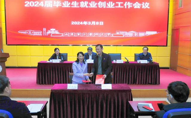 3月8日,学校召开2024届毕业生就业创业工作会议,党委书记刘军出席会议并讲话,校长管英俊同学院代表签订了工作目标责任书,副校长梁淑娟主持会议,党委委员、统战部部长刘汉波出席会议。