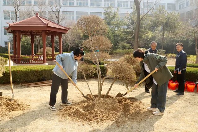植树现场,师生亲切交流、共同扶苗、填土、围堰、浇水,精心呵护着新的树苗扎根学校沃土。本次植树活动栽植木瓜海棠、垂丝海棠、造型小叶女贞共20余株。师生们迎着拂面春风,同心协作、通力合作,栽种下一株株树苗,也像是栽种了对山二医高质量发展的承诺和期望。